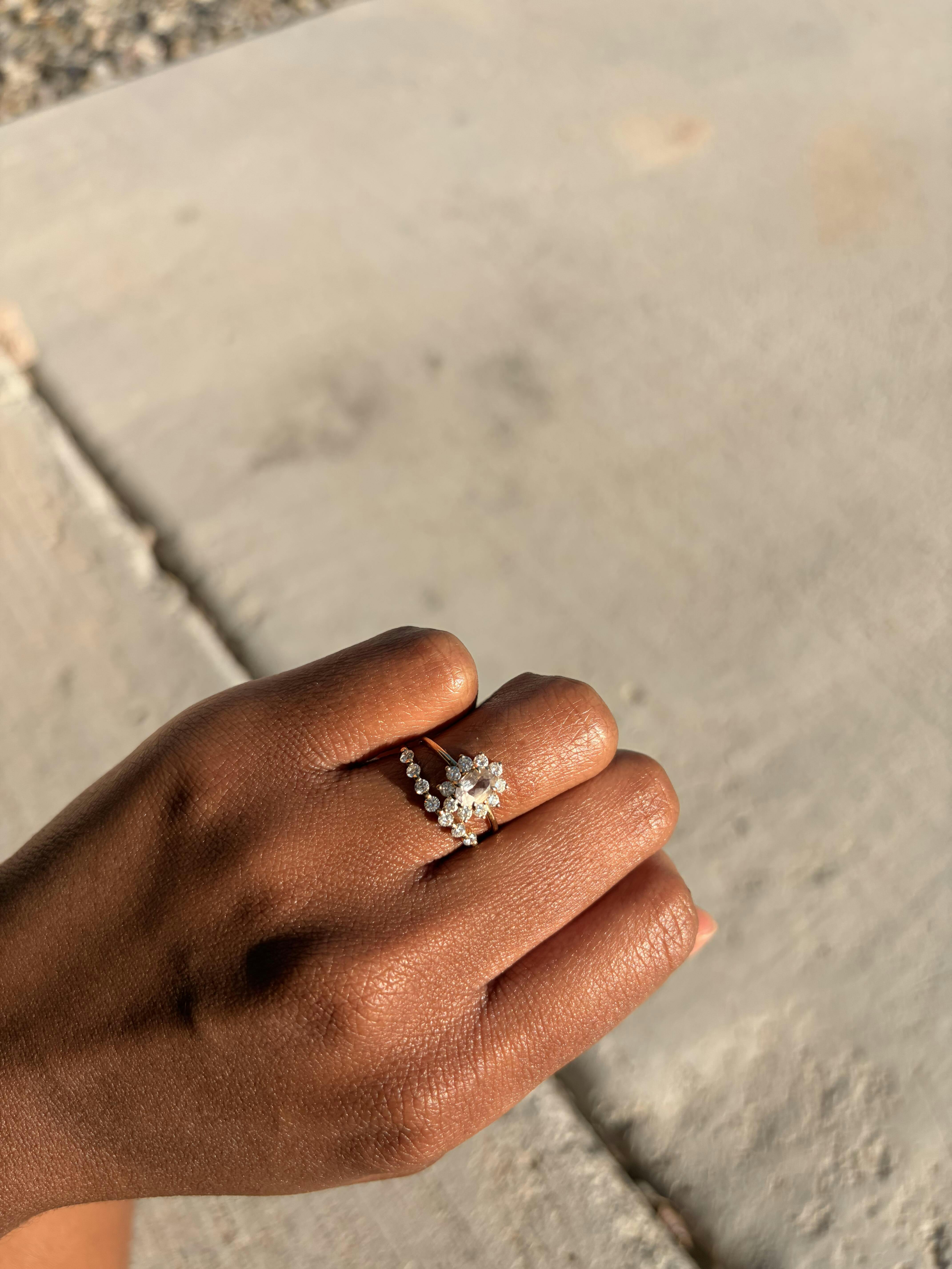 Sunburst Morganite Halo Ring - Evelina worn on hand with natural skin tone and soft white background