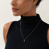 Close-up of woman wearing Diamond Initial Pendant 14k Gold - N layered with a delicate gold chain on a white top